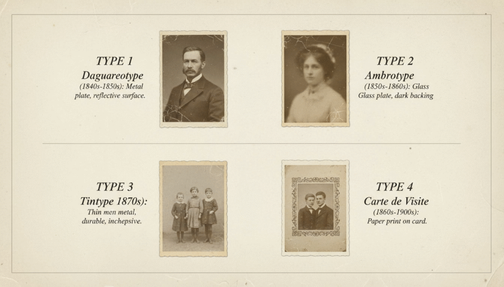 | Type 1 | Original photo developed from the original negative within ~2 years of the shot. | c. 1910 photo printed 1910–1912 | Press photo or studio print |