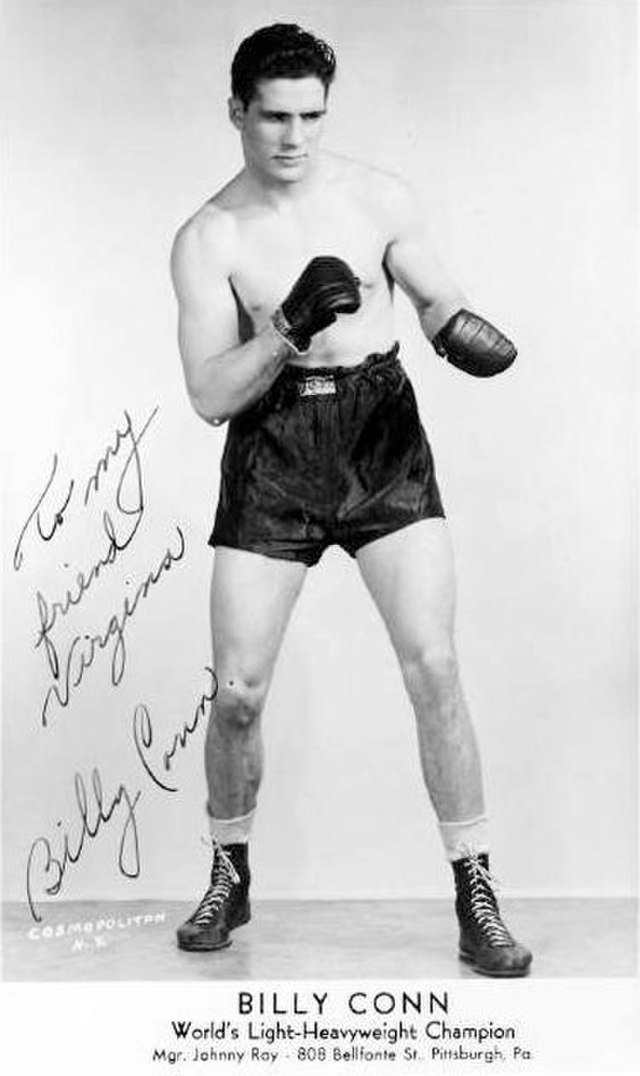 Billy Conn captured the Light Heavyweight Title in 1939 and became immortalized for his 1941 fight with Joe Louis, in which he nearly dethroned the heavyweight king through sheer speed and skill. His courage and charisma made him one of the 1940s’ most admired fighters.